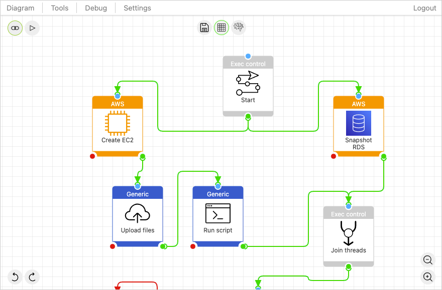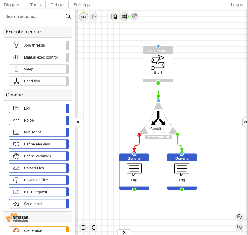 ...connect them with links attached to their in/out ports, handle errors using the 'KO' port and successes using the 'OK' port. Manage results generated by the actions using variables, perform actions and control the flow execution using conditions.